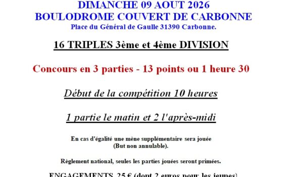 Une équipe Carbonnaise est engagée depuis cet après midi (mardi 13 mai 2025) à Saint Jory pour le championnat départemental Haute Garonne « vétérans ».Après avoir battu une équipe de Muret et une équipe de Launaguet, nos Carbonnais se sont qualifiés pour la suite de ce championnat, RDV à 08h30 demain matin. […]